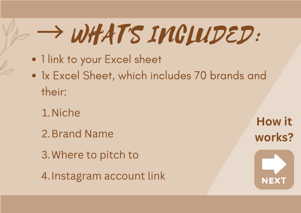 • 1x Excel Sheet, which includes 110+ brands and their: