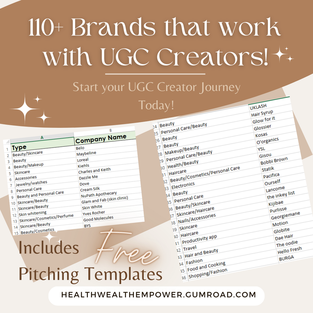 Brands to reach out to as a UGC Creator - are you ready to start you UGC journe? or take your UGC Creator business to the next level? This is an Excel sheet of Brands that are on the lookout for and constantly collaborate with UGC creators!