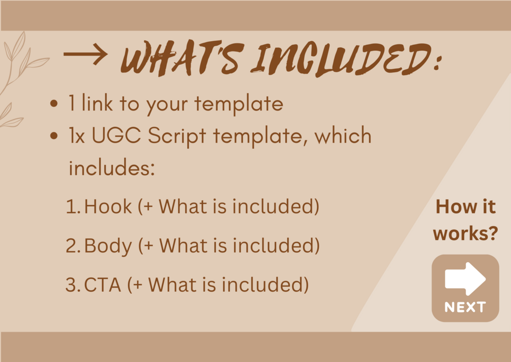 1x Script Template, customizable with Canva, which includes these sections: Hook (+ What should be included in this section), Body (+ What should be included in this section), and CTA (+ What should be included in this section). This is a digital download.