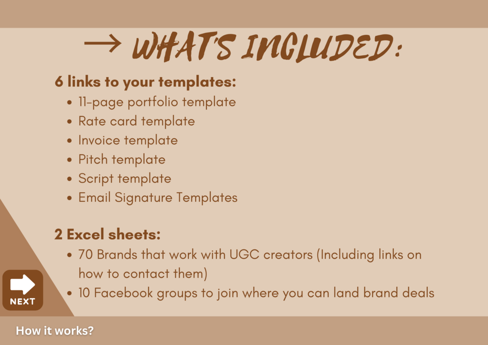 UGC Bundle Complete with: 11-page portfolio template, rate card template, invoice template, pitch template, script template, email signature template an excel sheet of 70 brands to reach out to and 10 Facebook groups to join!
