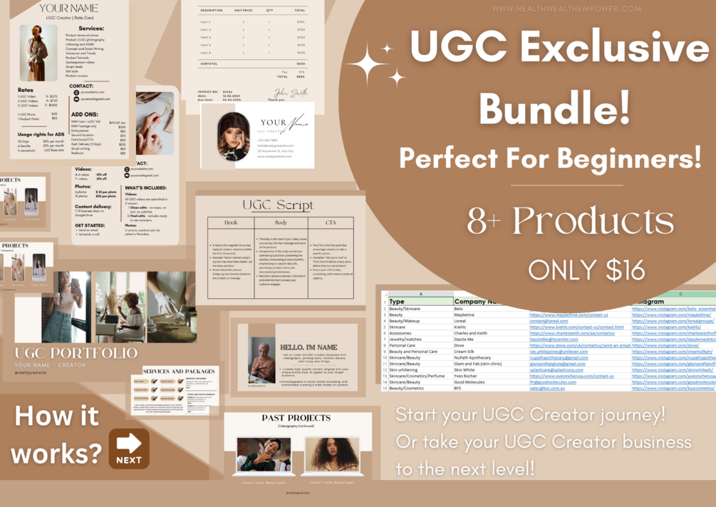 UGC Exclusive Bundle: Are you ready to start your UGC journey? Or take your UGC Creator business to the next level? Make an impact and impress brands with these amazing UGC customizable templates! Also, get an excel sheet of 70 brands to reach out to, including links to contact them, as well as an excel sheet of 10 amazing Facebook groups to join where you can land brand deals. Stop procrastinating and jumpstart your journey today! Get this bundle for $40 ONLY $15!