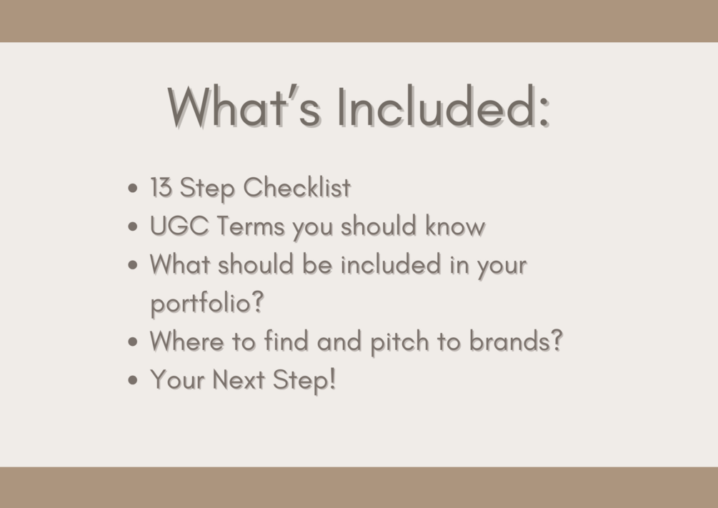 13 Step Checklist + UGC Terms you should know + What should be included in your portfolio? + Where to find and pitch to brands? + Your Next Step!